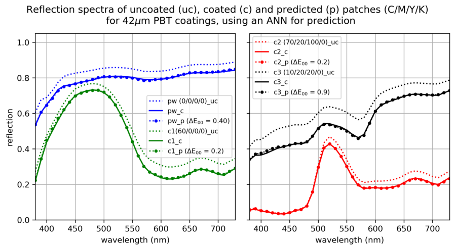 Ein Beispiel für einen erfolgreichen Einsatz dieses Ansatzes ist die spektrale Vorhersage der Remission nach erfolgter Folienkaschierung. Als Trainingsdaten diente hier ein Testchart mit 749 Farbpatches, das vor und nach der Kaschierung spektral vermessen wurde. Basierend auf diesem vergleichsweise kleinen Trainingsdatensatz konnte die spektrale Remission nach erfolgter Folienkaschierung mit großer Präzision vorhergesagt werden.