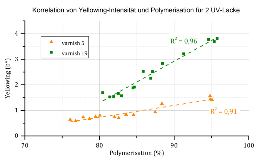 In einer Überblicksstudie mit einer Vielzahl marktverfügbarer UV-Lacke zeigten alle untersuchten Lacke ein deutlich messbares Yellowing. Für eine exemplarische Auswahl an Lacken konnte eine Korrelation zwischen Yellowing-Intensität und den mittels ATR-FT-Infrarotspektroskopie tatsächlich gemessenen Polymerisationsgraden festgestellt werden. Gemeinsam mit einem Industriepartner wurde dieser Ansatz im Rahmen eines BMWK-geförderten ZIM-Kooperationsprojektes (01/2018-05/2021) weiterentwickelt. Dabei wurde die Korrelation unter industriellen Produktionsbedingungen bestätigt und eine Methodik für den praxisgerechten Einsatz in industriellen Druck- und Beschichtungsprozessen entwickelt.