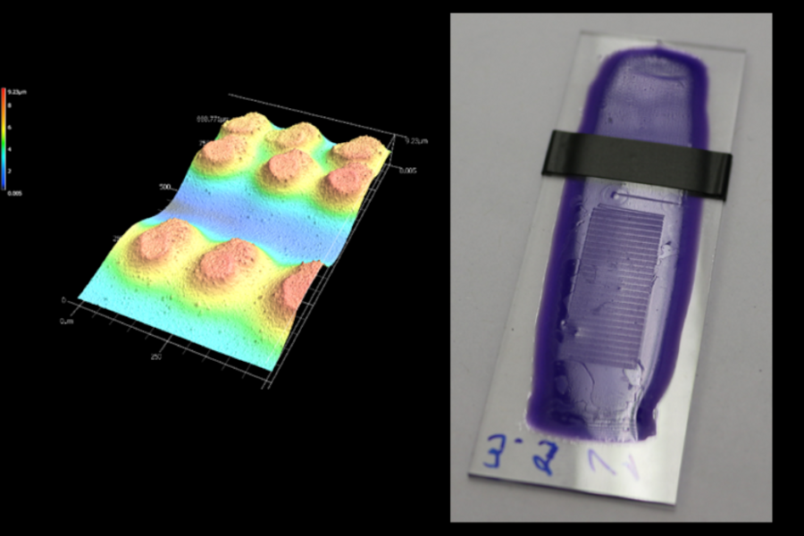 Dabei zeigte sich, dass die Schichtdicke mit reduzierten Polymerisationsgrad durch den Einsatz von UVC-Strahlung oder durch die Reduktion des Sauerstoffgehaltes (z.B. in einer mit Stickstoff gefluteten Belichtungskammer oder Bestrahlung durch UV-transparente Folien) vermieden werden kann. Hingegen konnte hochintensive UVA-Strahlung allein diese Schicht nicht vermeiden. Bei einer gerasterten Laserbelichtung konnte eine mikroskopische rasterförmige Topologie in die obere Farbschicht eingebracht werden, wodurch sich unter Verwendung der Lasermode verdeckte Mikroinformationen als Sicherheitsmerkmal in eine Farbschicht einbringen lassen. Zudem lässt sich mit dieser Methode ein Transmissionsgitter zur Erzeugung von Interferenzmustern erstellen.
